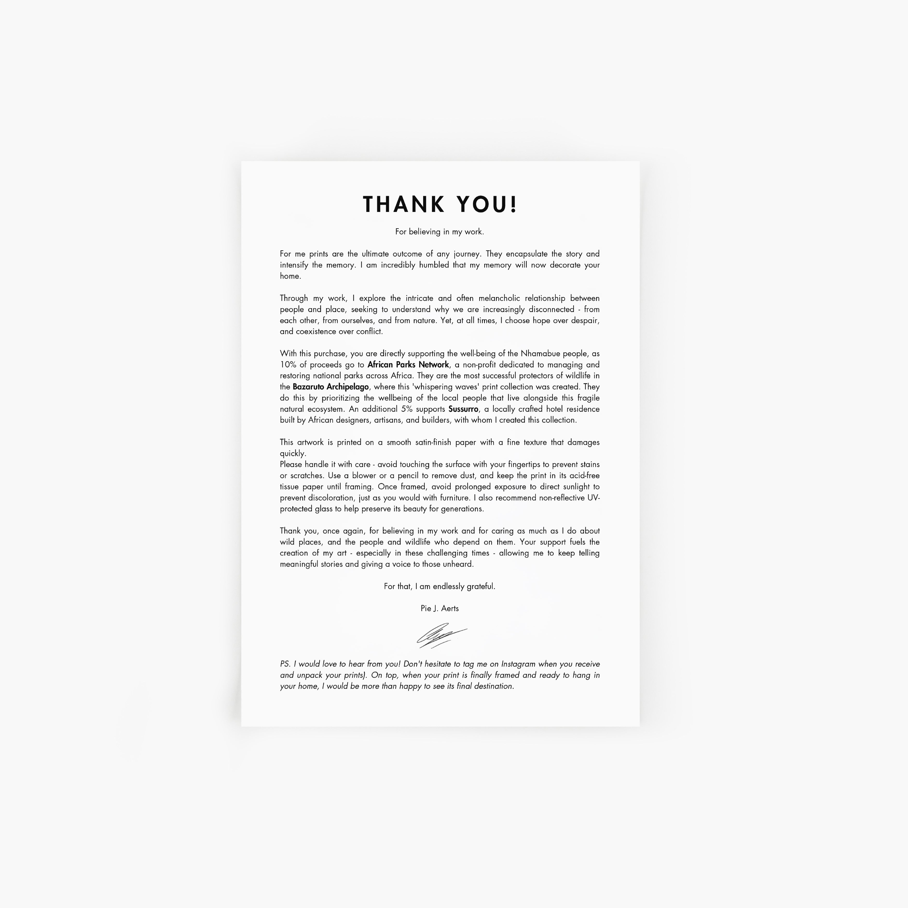 ◦ XL - 120cm x 150cm (47.24 × 59.06 inches), Edition of 10 - Presented on acid-free, archival cotton Photo Rag Giclée paper from Hahnemühle
